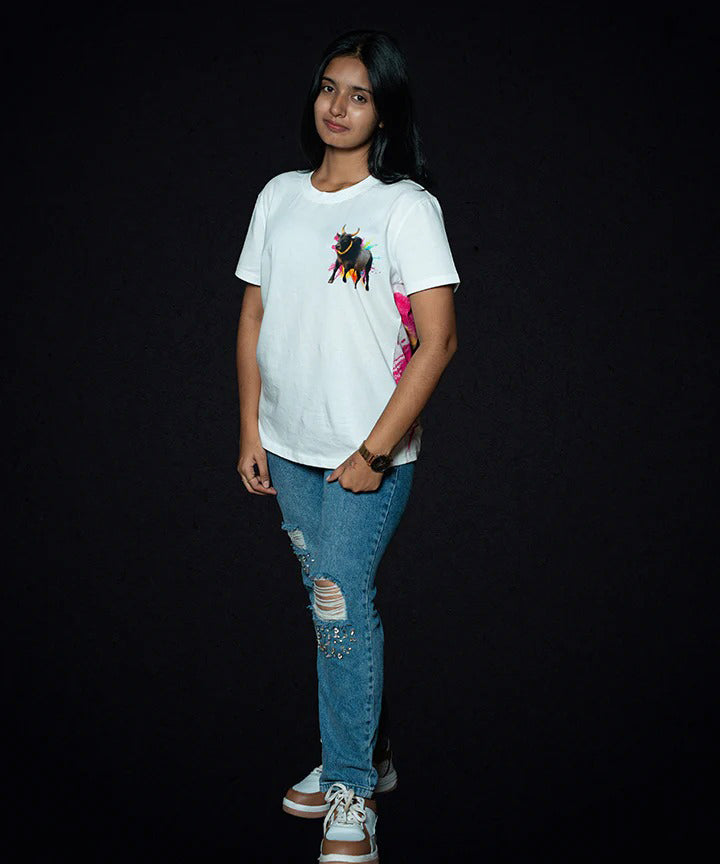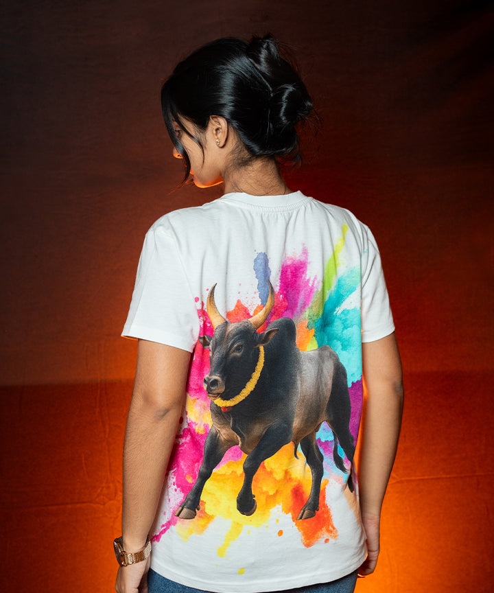 "Power of Tradition, Pride of the Land" this basic tee  a Kaalai madu(bull) at the back , "Invisible print feel" "No tactile texture" and more "This design was created with a special ink to ensure a soft print and lightweight-hand." Front chest small print