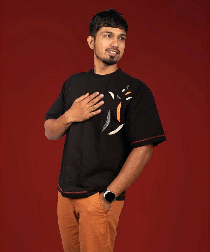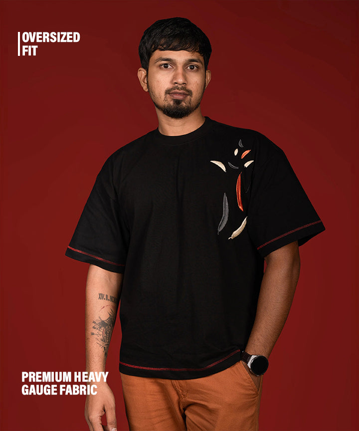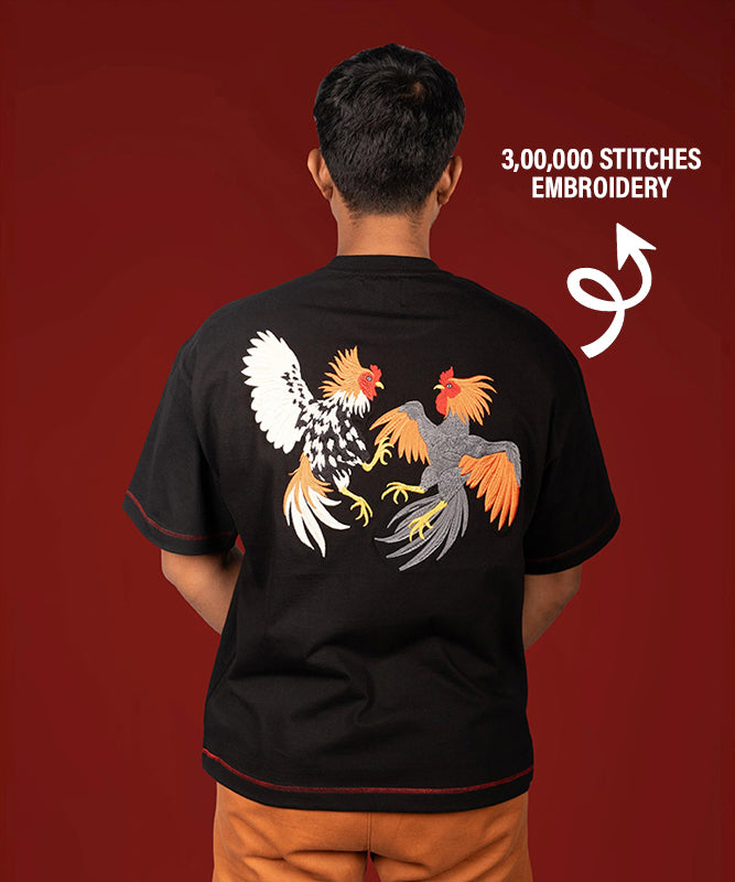 "Born to Battle, Built to Win", this oversized tee a Rooster 3,00,000 stitch Embroidery at the back. Front chest fether design.