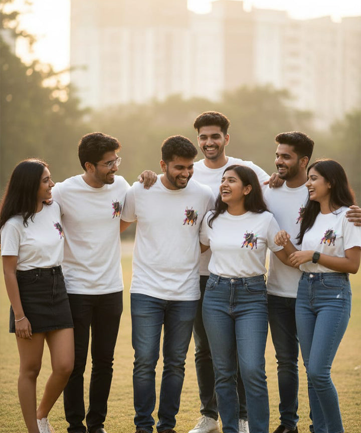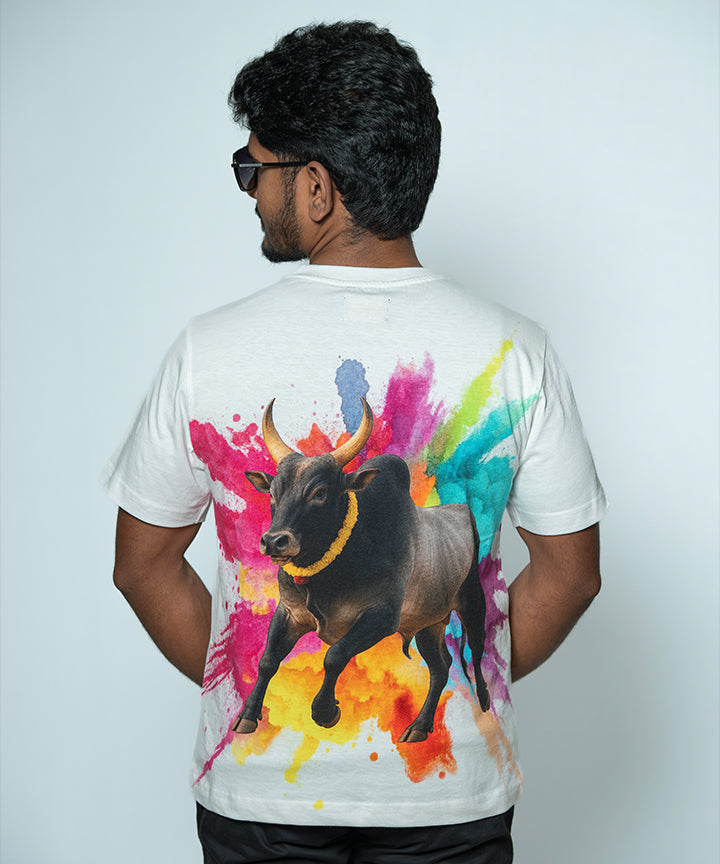 "Power of Tradition, Pride of the Land" this basic tee  a Kaalai madu(bull) at the back , "Invisible print feel" "No tactile texture" and more "This design was created with a special ink to ensure a soft print and lightweight-hand." Front chest small print